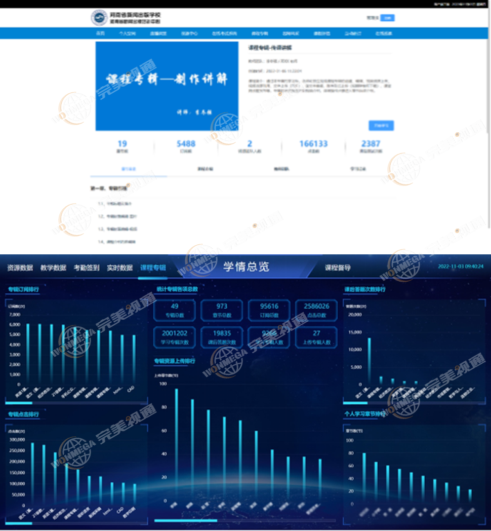 实现统一平台、统一管理,可以清楚的看到各分项总数,以及不同课程专辑的订阅数、课后答题次数等数据;另外还有考勤统计、教学数据统计等。