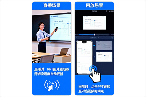 在回放时识别的 PPT 图片可以与视频对应时间,点击PPT 跳转至对应的视频时间点