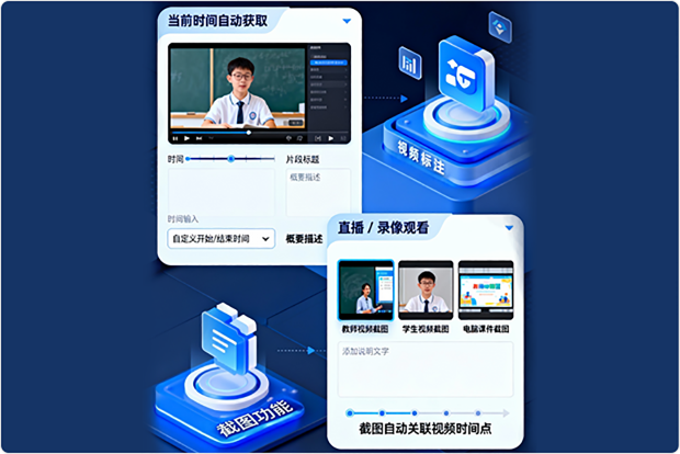 观看直播或点播录像视频时支持一键截图,同步截取教师视频、学生视频、电脑课件画面的视频截图