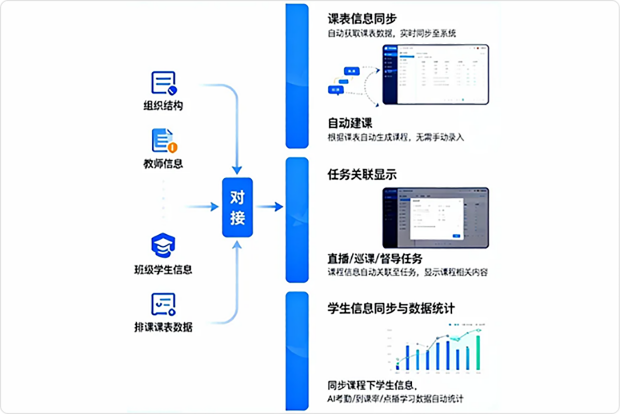 与学校教务系统进行数据对接、自动获取组织结构数据、教师信息数据、班级学生信息数据、排课课表数据
