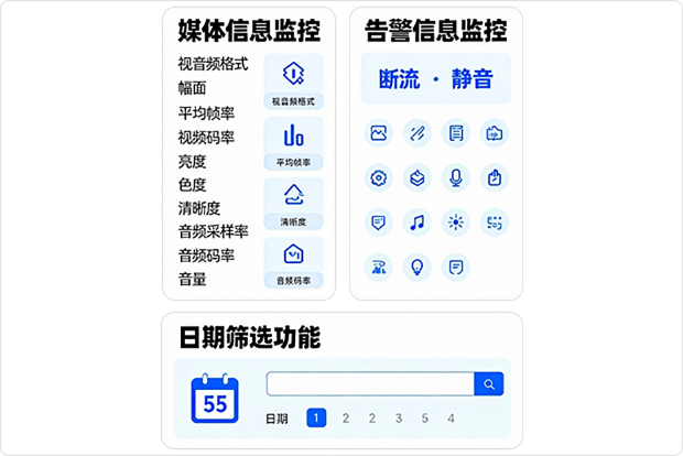 支持媒体信息监控:视音频格式、幅面、平均帧率、视频码率、亮度、色度、清晰度、音频采样率、音频码率、音量、噪音等
