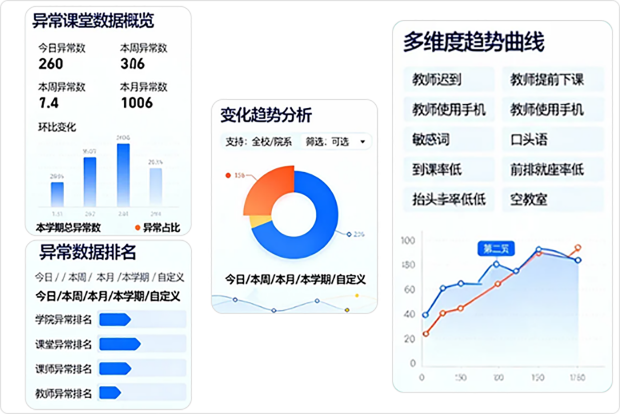 支持异常课堂数据展现,展示今日、本周、本月及环比变化,展示本学期异常课堂总数量、异常课堂数量占比