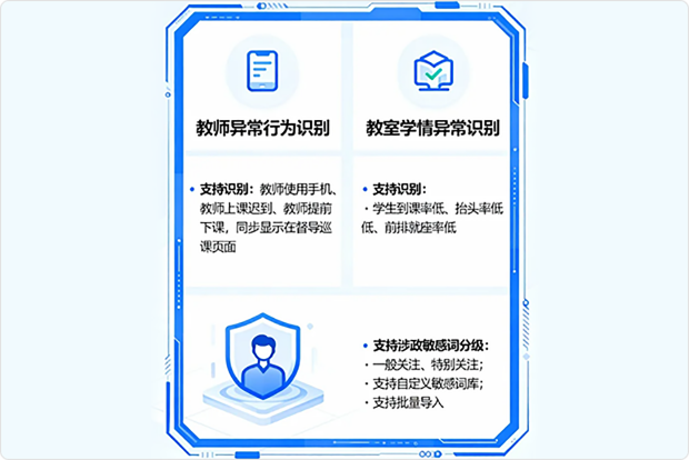支持识别教师异常行为:教师使用手机、教师上课迟到、教师提前下课,同步显示在督导巡课页面